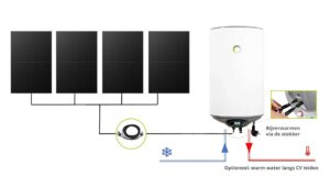 Met deze opzet maak je directe gebruik van de opgewekte zonne-stroom: alle energie gaat meteen in het verwarmen van het water.